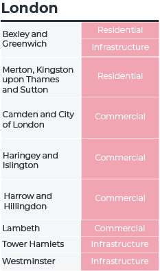 Given the varying nature in the size of construction projects, construction hotspots may also show due to a single large project in one sector (see table below). Although these may be viewed as skewing results, they still represent a significant driver of regional growth and activity and were a key driver of hotspots throughout the country. These tend to be high-value transport or utilities projects in the infrastructure sector where contracts are awarded, but take time to build out – such as the Hornsea Project Three offshore wind farm, the Lower Thames Crossing and two projects for the Eastern Green Link 2. There was also a broader spread of construction sectors in the top ten in this year’s report – the Google data centre in Waltham Cross, the former ITV studios redevelopment into offices on the South Bank in London, as well as the Agratas gigafactory in Somerset.