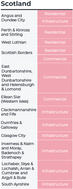 There were no broad hotspots in 2024 – where contract awards in each of the three main construction sectors of residential, commercial and infrastructure, were significantly above the long-term average. In this year’s report, single-sector hotspots in residential, commercial or infrastructure were most common, although there were several reporting hotspots in two sectors of construction. Encouragingly, regions with single or double hotspots were spread across Great Britain. Moreover, hotspots outnumbered coldspots in all regions of Great Britain except Wales and the most hotspots were registered in Scotland, the East of England, and the South East.