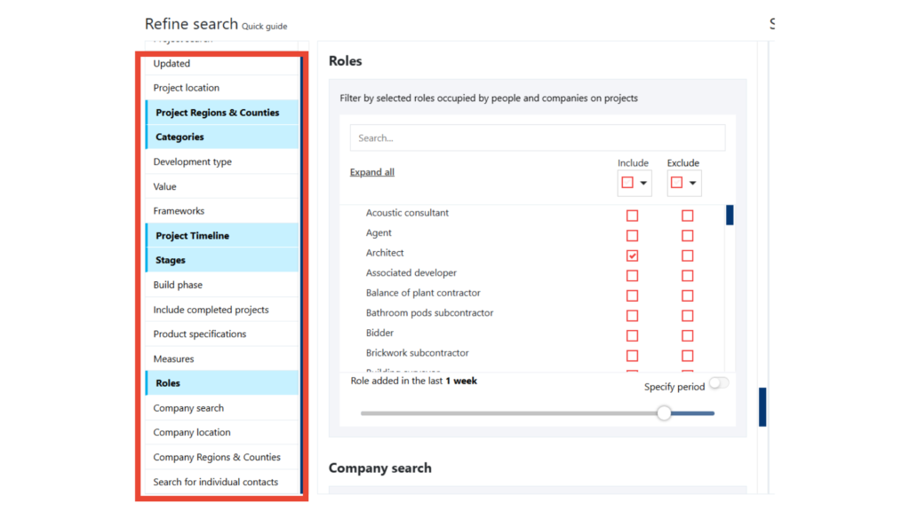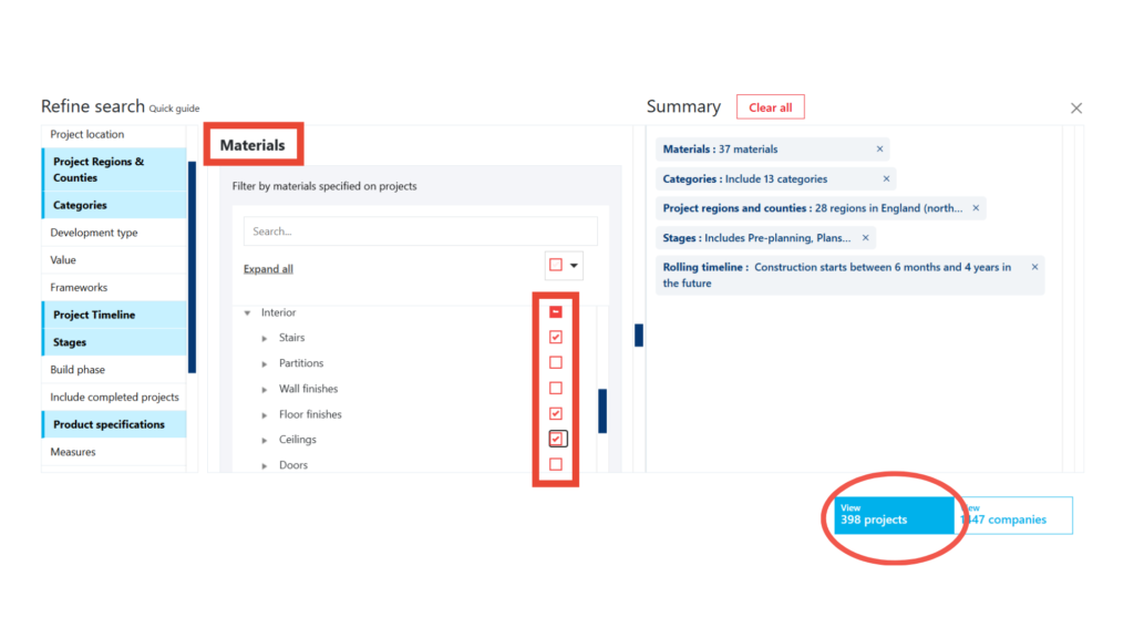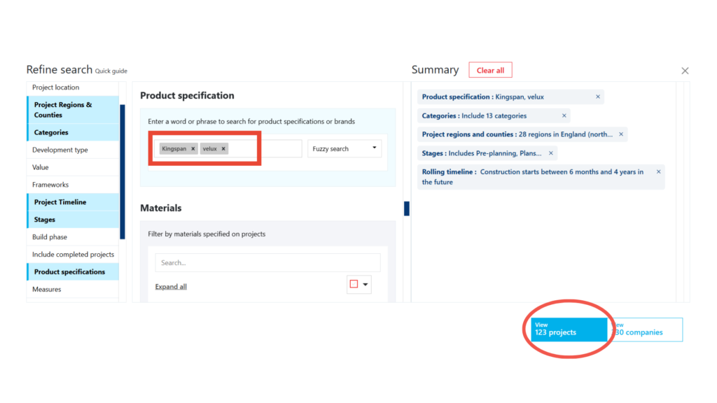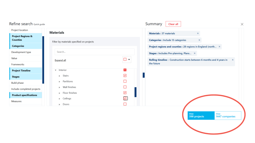 Directly available on our Construction Project Leads Platform, the tool is easy-to-use and sits within our advanced filtering. This means you can specify all your target project criteria including the product specifications, and save it as a search to return to time and time again.