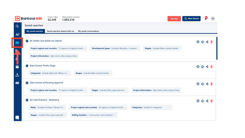 Once you’re happy with your custom search, you can save your criteria so you can access this list again and again to view live updates and capture more target projects.