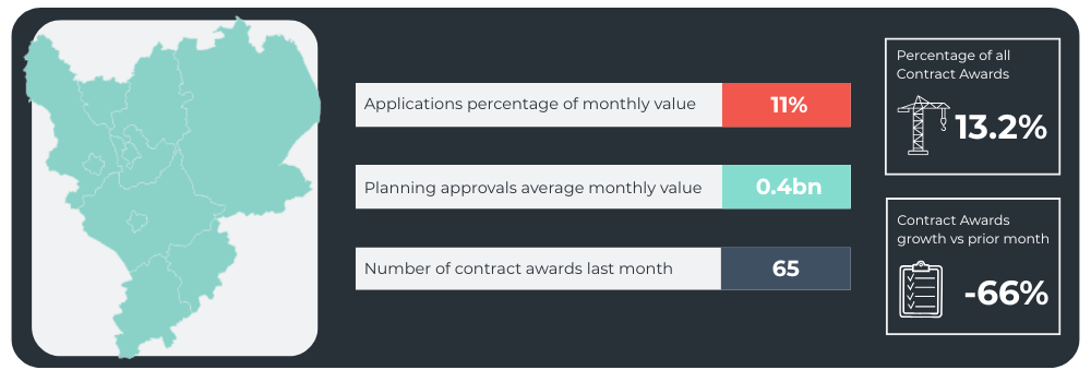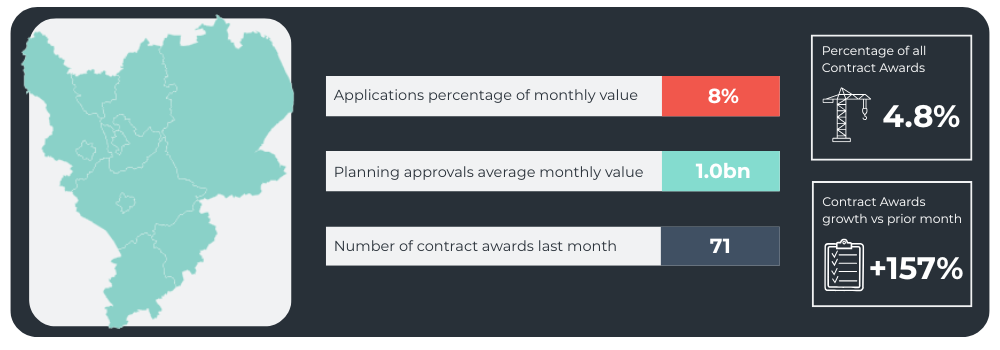 In September, planning applications in Yorkshire & Humber totalled £510m. Planning approvals in Yorkshire & Humber accounted for 4% of all values, with the Hotel, Leisure & Sport sector receiving the most approvals. The Infrastructure sector received £646m of contract awards, the highest total of all sectors in Yorkshire & Humber.