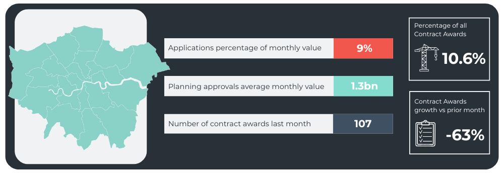 In September, planning applications in London totalled £850m. Planning approvals in London accounted for 11% of all values, with the Commercial & Retail sector receiving the most approvals. The Residential sector received £372m of contract awards, the highest total of all sectors in London.