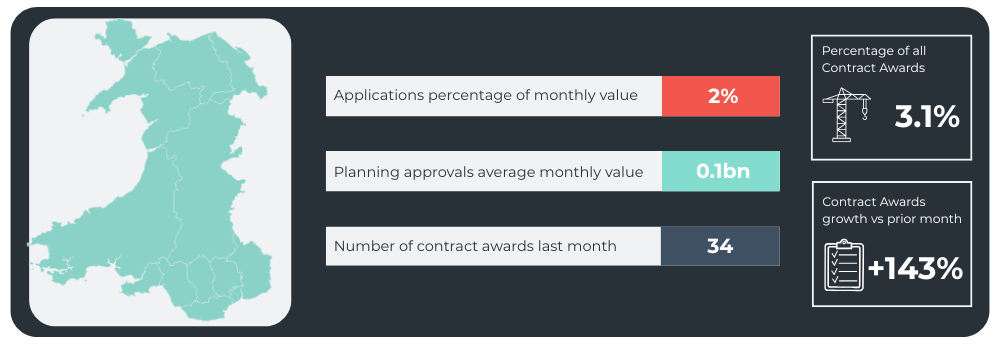 In September, planning applications in Wales totalled £140m. Planning approvals in Wales accounted for 1% of all values, with the Education sector receiving the most approvals. The Infrastructure sector received £111m of contract awards, the highest total of all sectors in Wales.