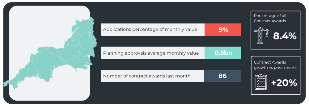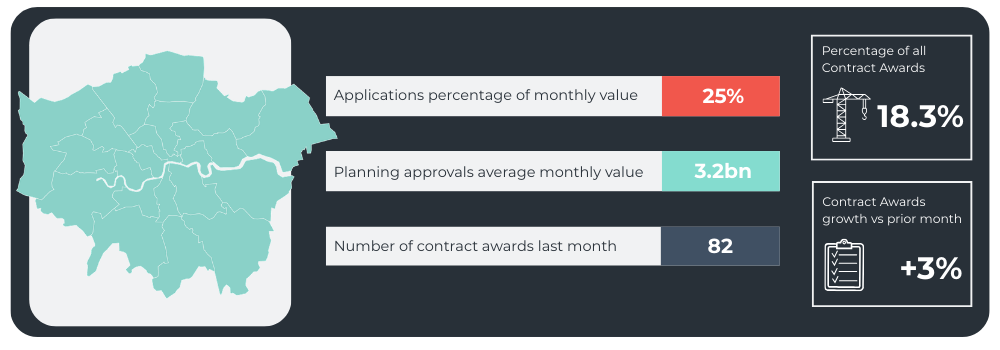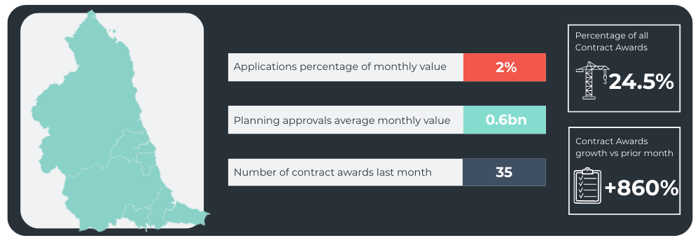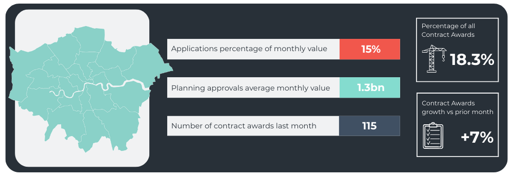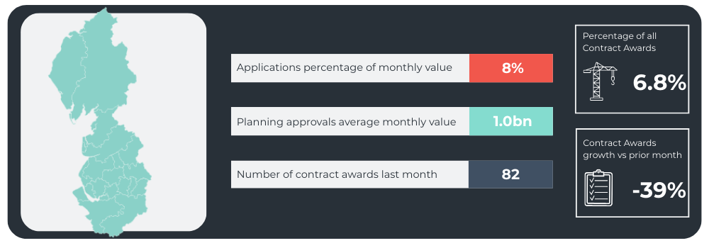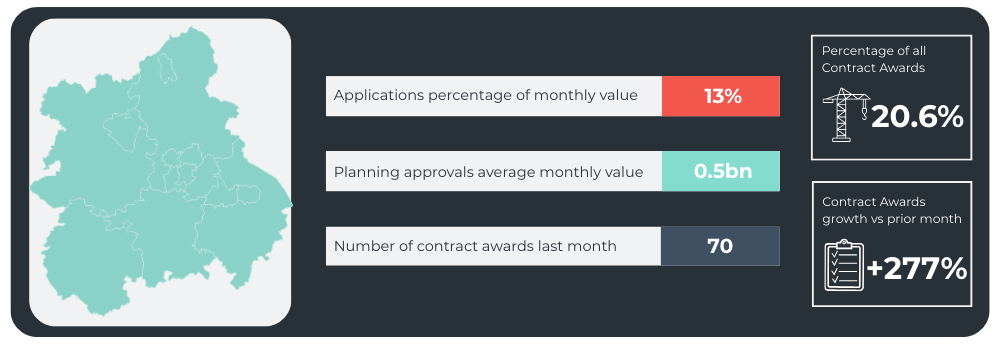 Planning approval and contract award intelligence considers the highest value ranked projects from the previous month. Planning applications are presented a month in arrears due to the time delay between the application date and council publication.