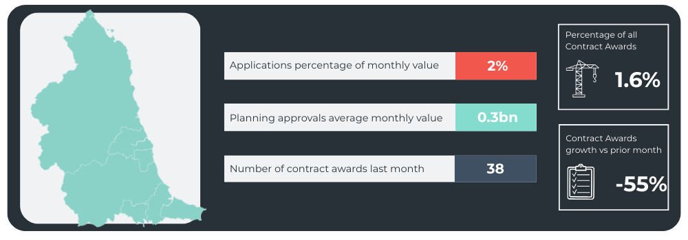 In December, planning applications in Yorkshire & Humber totalled £210m. Planning approvals in Yorkshire & Humber accounted for 6% of all values, with the Industrial sector receiving the most approvals. The Industrial sector received £231m of contract awards, the highest total of all sectors in Yorkshire & Humber.