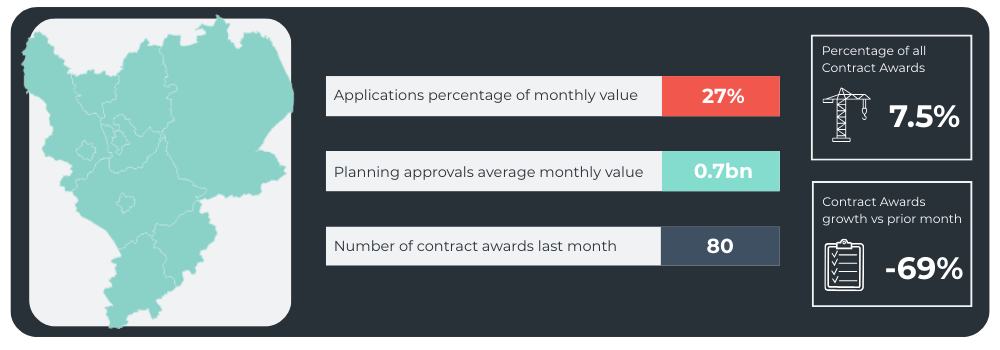 In December, planning applications in the East Midlands totalled £260m. Planning approvals in the East Midlands accounted for 7% of all values, with the Medical & Healthcare sector receiving the most approvals. The Infrastructure sector received £447m of contract awards, the highest total of all sectors in the East Midlands.