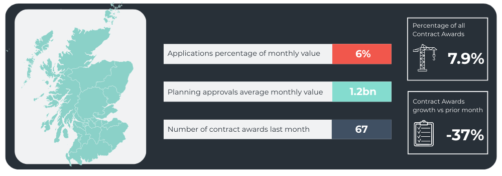 In December, planning applications in Scotland totalled £220m. Planning approvals in Scotland accounted for 5% of all values, with the Education sector receiving the most approvals. The Infrastructure sector received £415m of contract awards, the highest total of all sectors in Scotland.