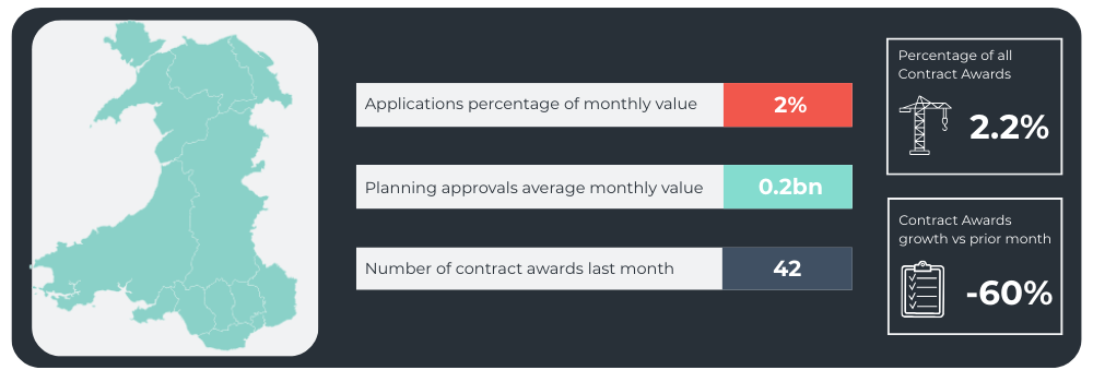 In December, planning applications in Wales totalled £310m. Planning approvals in Wales accounted for 3% of all values, with the Medical & Healthcare sector receiving the most approvals. The Infrastructure sector received £273m of contract awards, the highest total of all sectors in Wales.